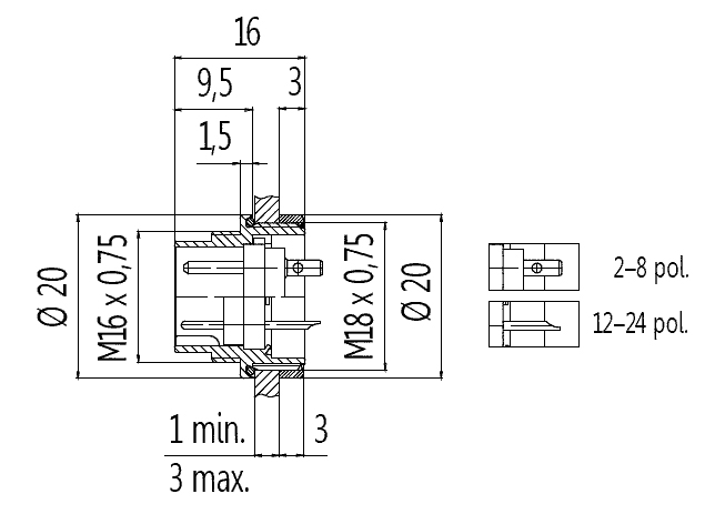 針數(shù) Number of contacts 2 3DIN 4 5 5(Stereo) 6DIN 7 7DIN 8DIN 12 14 19 24 鎖緊方式 Connector locking system 螺紋式 / screw 連接方式 Termination 焊接 / solder 連接截面 Wire gauge max.0.75mm 2 (max.AWG 20) max.0.25mm 2 (max...